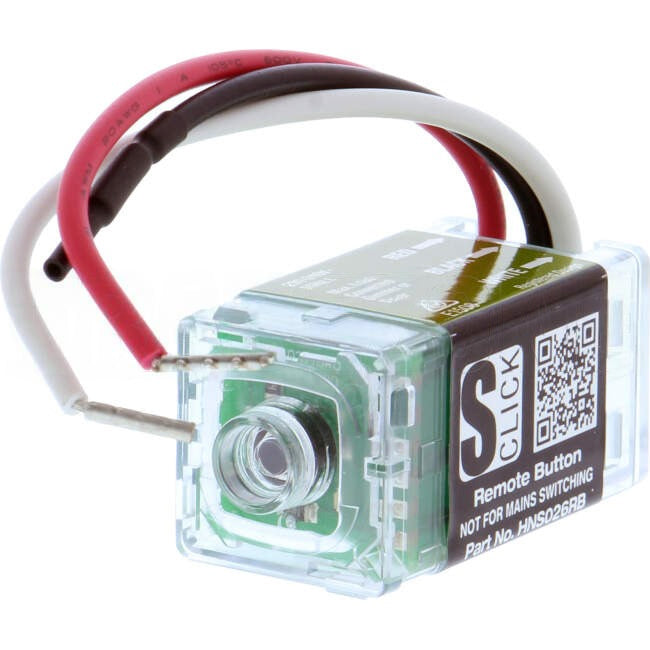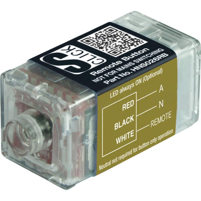 The HNS026RB Remote Button enables multi-way dimming and ON/OFF with the S-Click Digital Dimmers HNS616DT and HNS626DT or multi-way ON/OFF with the S-Click 3-Wire timer switches HNS446TM and HNS456TM. An inbuilt LED indicator can be configured two ways by connecting Neutral to the HNS026RB. The LED indicator can be permanently ON, or ON while the button is pressed. The HNS026RB will operate without neutral connected but the LED indicator will not function. Multiple HNS026RB can be connected in parallel to a single dimmer or a single 3-wire timer provided the total length of the remote connection does not exceed 50 metres.