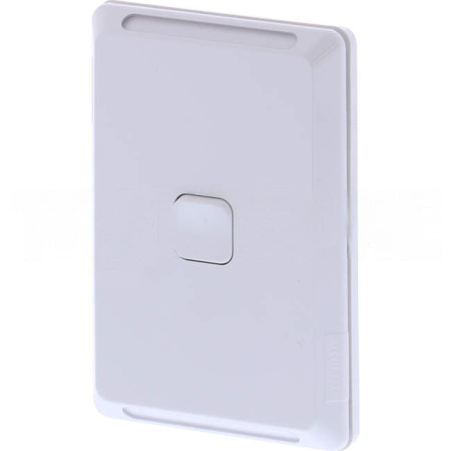 Switch assembly. Pro Series skin, grid and switch mechanism are included. Suitable for 1-gang vertical installations. Clipsal Pro Series. IP: 44. Colour: Extra White Rated current: 20A / 16AX Operating voltage 250V a.c. 50Hz Note: Requires installation by an appropriately licenced electrician.