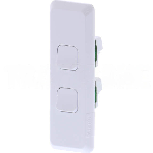 Switch assembly. Pro Series skin, grid and switch mechanism are included. Suitable for 2-gang architrave installations. Assembled with plate. Clipsal Pro Series. Colour: Extra White Rated current: 10AX. Operating voltage 250V a.c. 50Hz Note: Requires installation by an appropriately licenced electrician.
