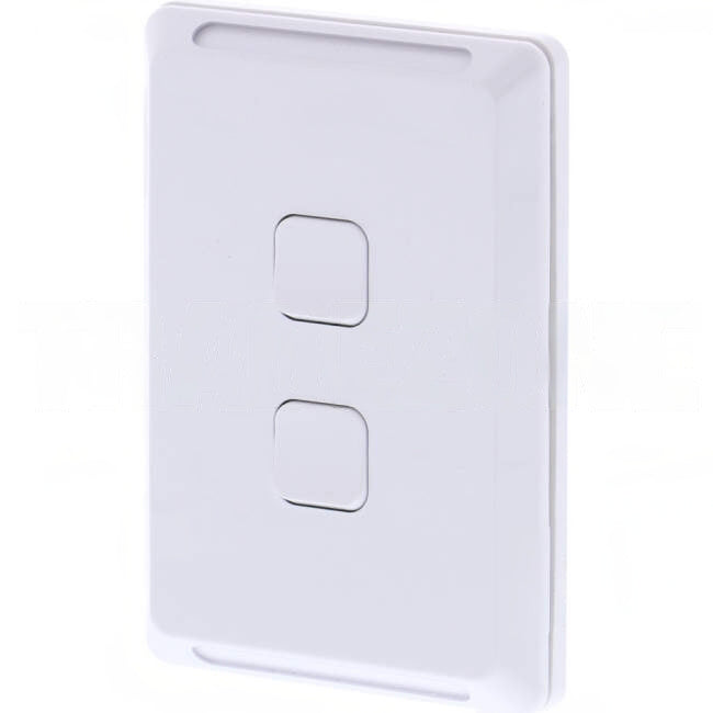 Switch assembly. Pro Series skin, grid and switch mechanism are included. Suitable for 2-gang vertical installations. Clipsal Pro Series. IP: 44. Colour: Extra White Rated current: 20A / 16AX Operating voltage 250V a.c. 50Hz Note: Requires installation by an appropriately licenced electrician.