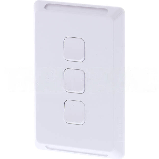 Switch assembly. Pro Series skin, grid and switch mechanism are included. Suitable for 3-gang vertical installations. Clipsal Pro Series. Colour: Extra White Rated current: 20A / 16AX Operating voltage 250V a.c. 50Hz Note: Requires installation by an appropriately licenced electrician.