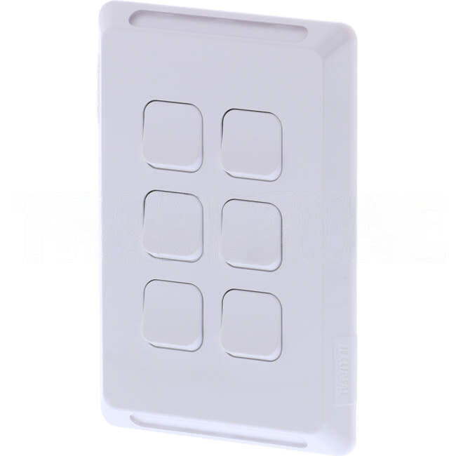 Switch assembly. Pro Series skin, grid and switch mechanism are included. Suitable for 6-gang vertical installations. Clipsal Pro Series. Colour: Extra White Rated current: 20A / 16AX Operating voltage 250V a.c. 50Hz Note: Requires installation by an appropriately licenced electrician.