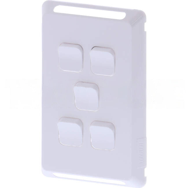 Secure clip-on skin. Used with switches. Suitable for 5-gang installations. Clipsal Pro Series. Colour: Extra White