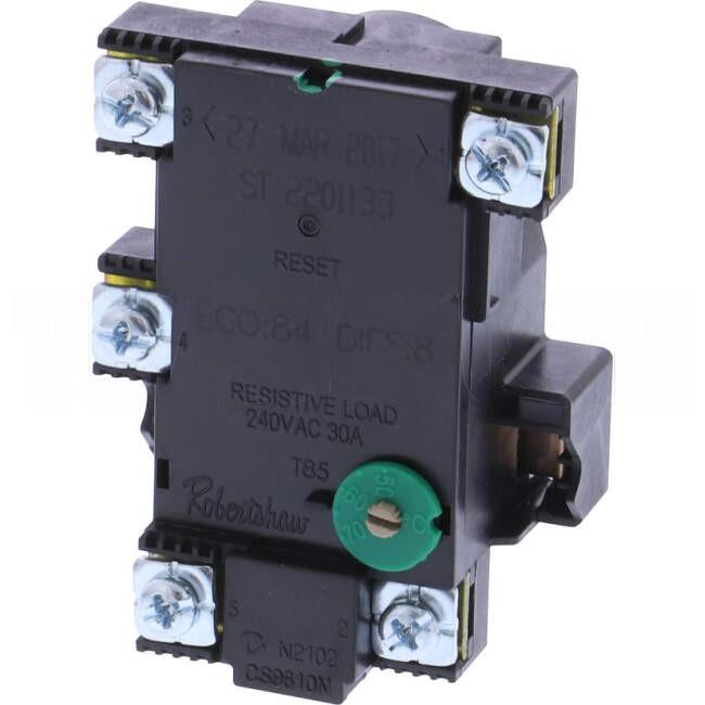 Robertshaw Thermostat Hot Water Heater Surface Mount With Adjustable Temperature Range 50-70 Degrees Celcius Eco And Manual Reset Over Temperature Cut-Out. Used For Top Element Of Dual Element Mains Pressure Electric Hot Water Heater Systems