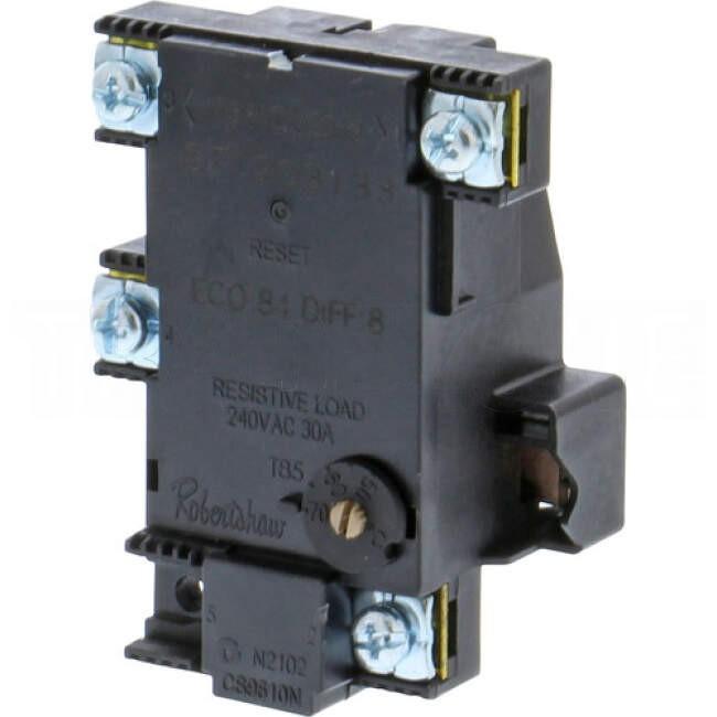 Robertshaw surface mount eco electric hot water heater thermostat with adjustable temperature range 50-70 degrees Celsius and built in manual reset over temperature cut-out. Suits most modern electric hot water heater systems with single element or can be used in conjunction for dual element hot water heater systems.