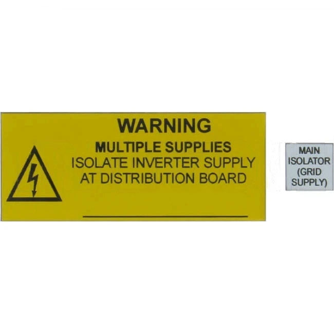 2. Warning Multiple Supplies..At Distribution Board This label is used if the solar system is connected to a distribution board, then the label is located on main switchboard and all intermediate distribution boards, yellow label with black engraving