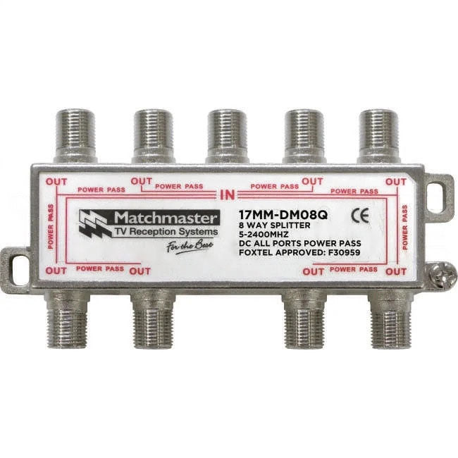 The 17MM-DM08Q is a Foxtel approved A-Class 8 way 'F' type splitter covering frequencies from 5 to 2400Mhz, making it ideal for satellite and terrestrial connections. The DM08Q is an all port power pass splitter for DC voltage throughput, which makes it perfect and simple to use with Matchmaster's range of DC masthead amplifiers. The DM series splitters are available from 2 way to 8 way to cater for all of your needs.