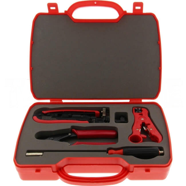 Kit contains 1 x compression tool, 1 x non slip lockable cable cutter, 1 x coaxial cable stripper and 1 x "F" removal tool.