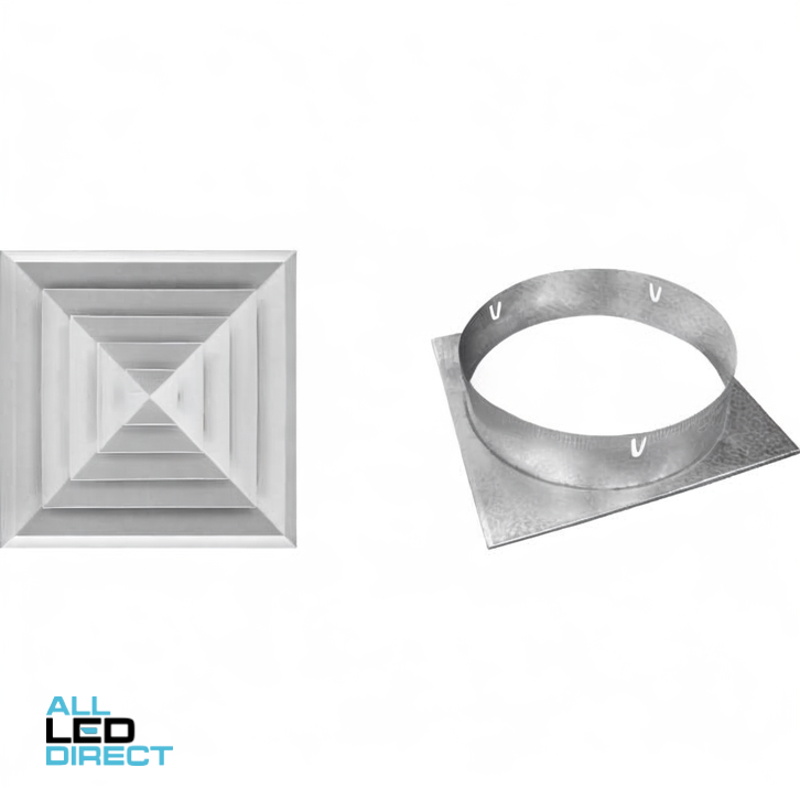 Upgrade your space with confidence and precision with the Powerwave Air 420mm x 420mm (Face) 4 Way Bevelled Edge Diffuser Complete with 250mm Neck Adaptor.