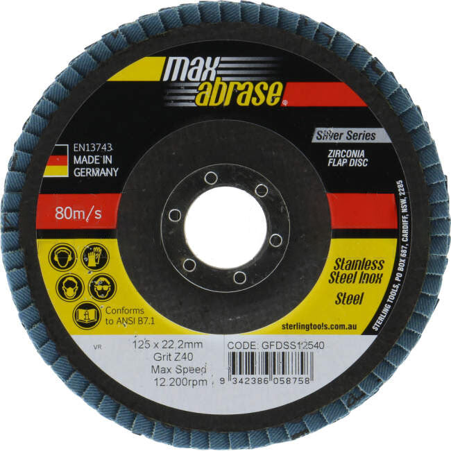 - MaxAbrase Flap Discs are premium quality discs made in Germany using quality Zirconia abrasive material, to produce the ultimate performer in mild steel and stainless steel grinding and finishing applications